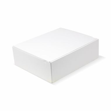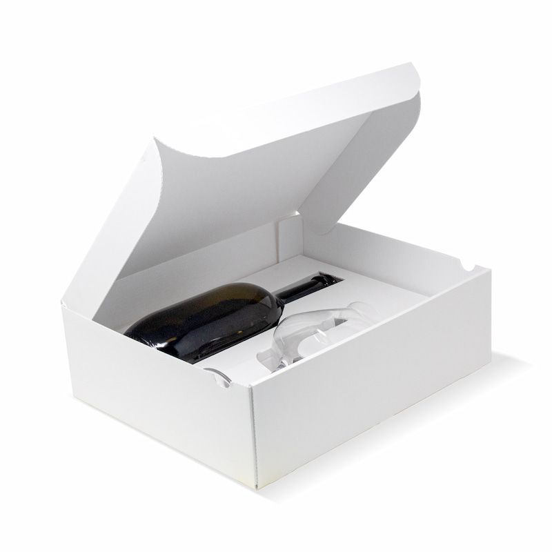 The box mod. FRANK 32x26x10 cm with box opening perfect for containing food and non-food products. Available in white or brown corrugated cardboard, the box is also ideal for shipping. Can be accessorized with 75 cl bottle holder and glass.
