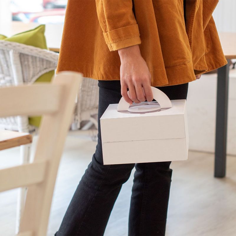 This box is equipped with lift-up handles and a plastic-coated window that allows you to show the product inside the box. Your delights will thus be seen by everyone not only when they are displayed in your window, but also in their take-away to your customer's home!