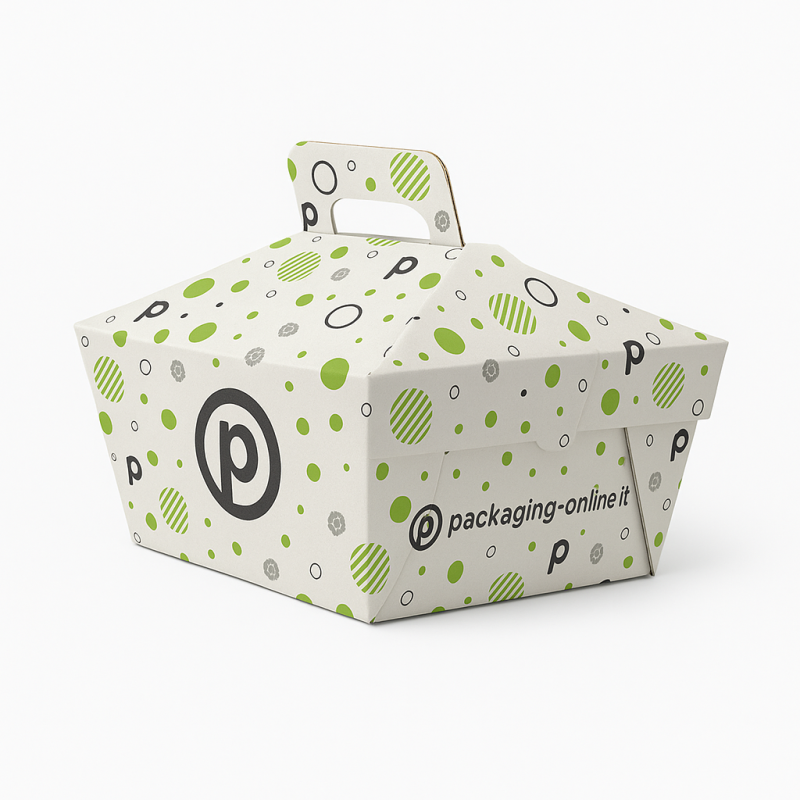 Box with handle for spit-roasted, fried and hot dishes. Resistant to liquids and greases. Four-colour printing on the entire surface.