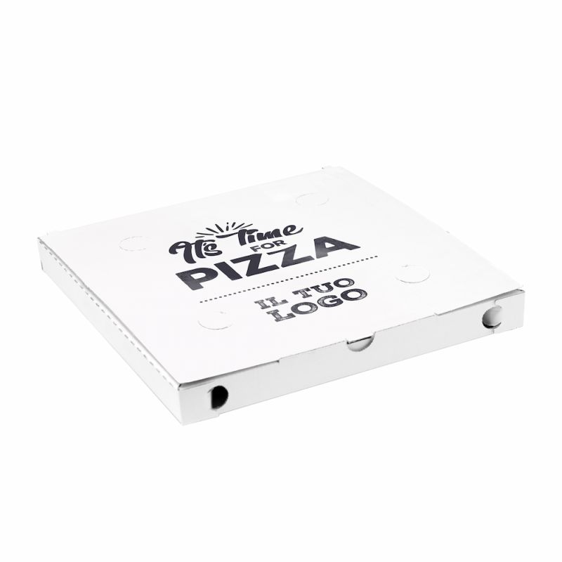 The white 33x33x3.5 cm pizza boxes customizable in four-color process on a predefined area with your microwave cardboard graphics is ideal for transporting pizzas and focaccias. Made of resistant material, it guarantees excellent protection of the product during transport.