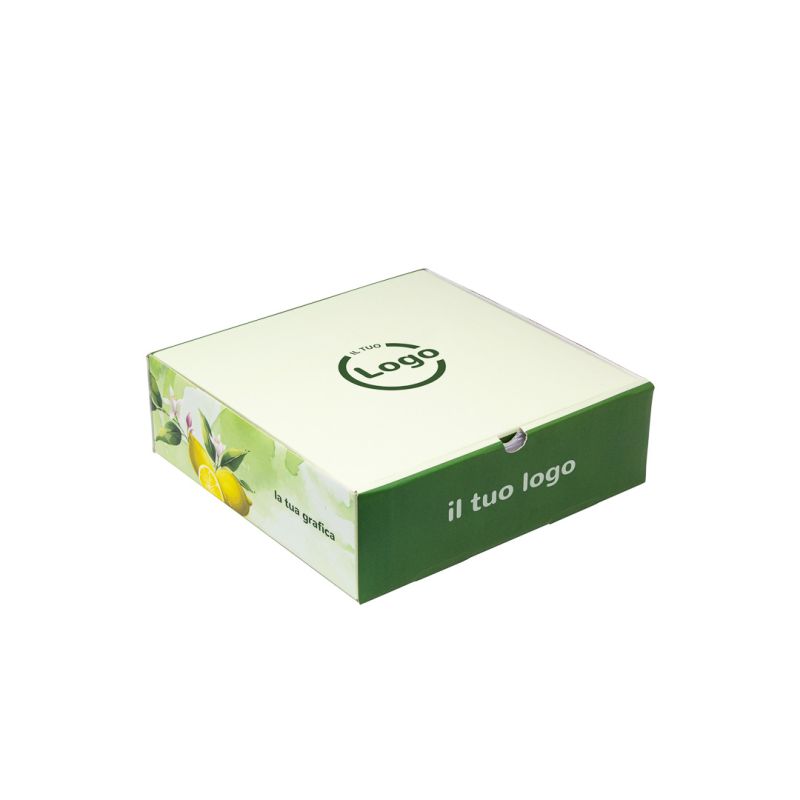 The Frank model box 19x19x7 cm in microwave cardboard coupled with patinated cardboard can be customized with the logo and / or four-color graphics on the entire surface. Available with white or havana background, it is ideal for packaging cakes, biscuits, pies, cannoli and non-food products, guaranteeing protection and elegance.