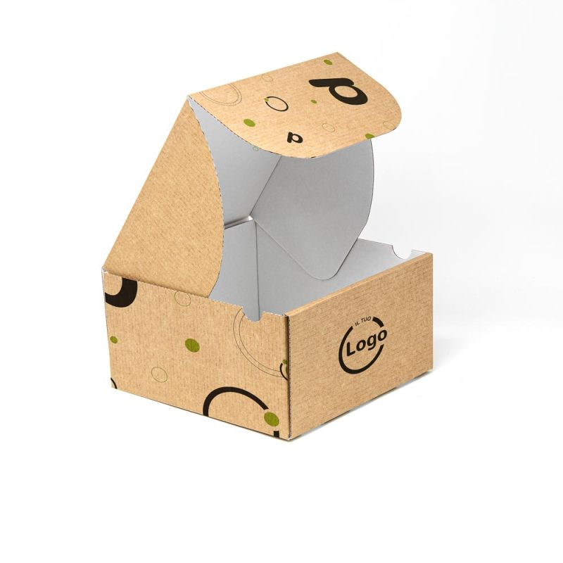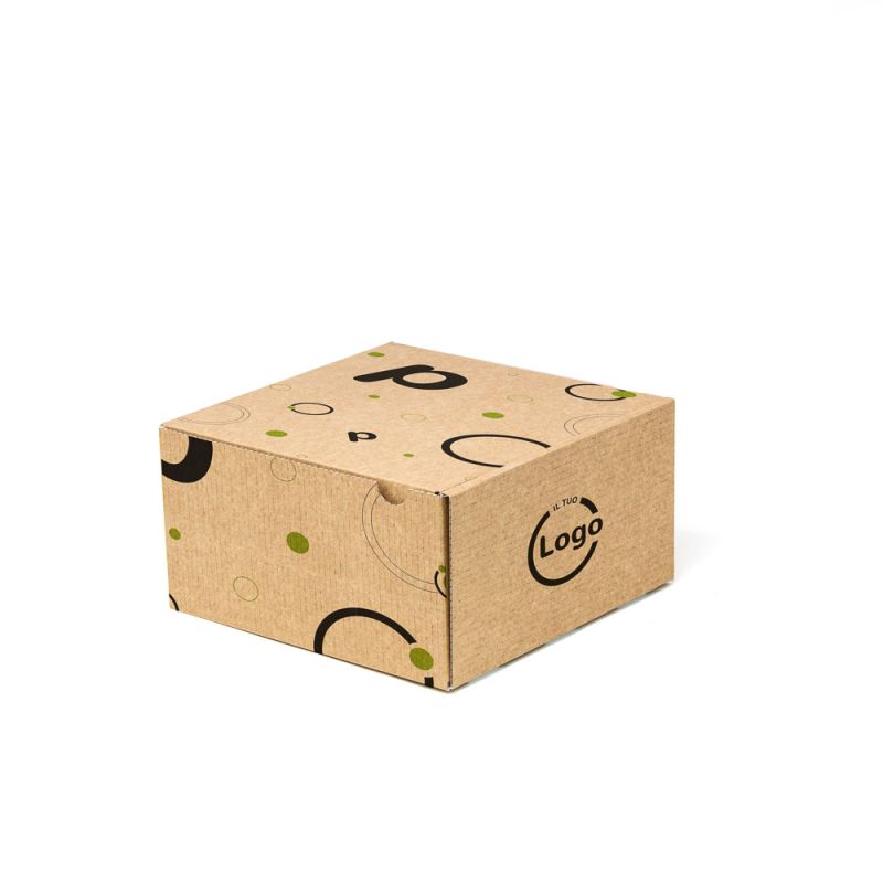 The box mod. FRANK 18.5x18.5x10 cm with box opening can be customized in four-color process on the entire surface (no full bottoms) and made of white or havana microwave cardboard. Suitable for food and non-food products, it is ideal for shipping.