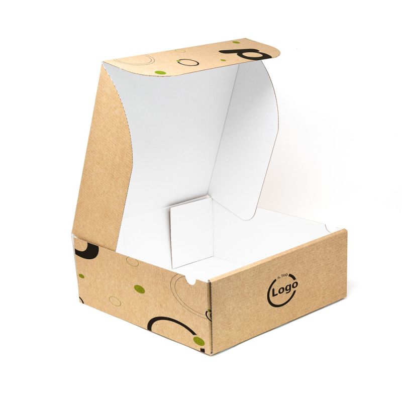 The box mod. FRANK 25x25x6 cm with box opening can be customized in four-color process on the entire surface (no full bottoms) and made of white or havana microwave cardboard. Suitable for food and non-food products, it is ideal for shipping.