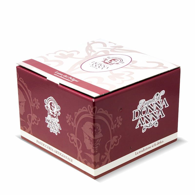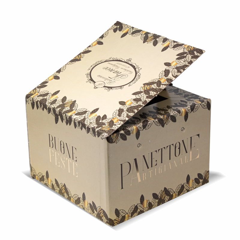750 g panettone box, 23x23x16 cm format, made of high quality laminated cardboard with four-colour offset printing on the entire surface, even with solid backgrounds and complex graphics. Extra processes such as glossy/matte lamination, hot stamping or screen printing can be added, as well as internal customization. A premium, resistant and elegant solution, designed to enhance your handcrafted products and make the packaging unique.