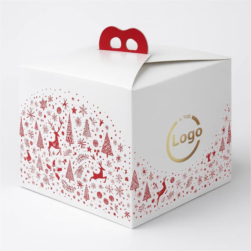1 kg box for panettone, size 25x25x18 cm, made of flat cardboard with glossy external lamination (excluding Havana model). Customization takes place with hot stamping on 2 fronts of the box on a predefined area (see more info below), for an elegant and refined effect. Available in several graphic variants: glossy white, havana, with brown or red "SNOW" graphics, red/brown/gold "REDS" and "SLED". Equipped with an integrated handle for practical and safe transport. Ideal for fine Christmas packaging.