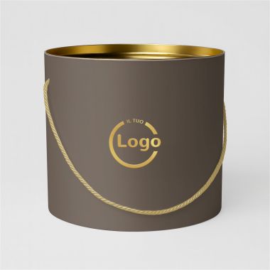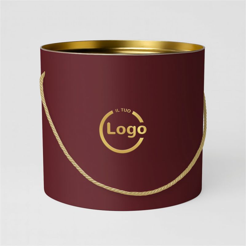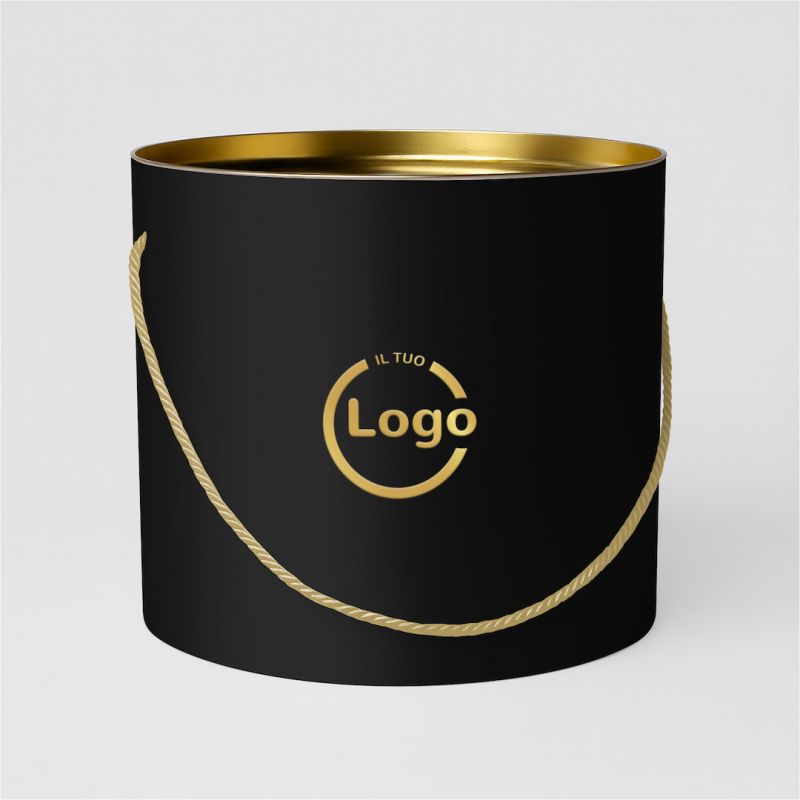 These cylindrical boxes, with a diameter of 25 cm and an internal height of 21 cm (external 23 cm), are made of microwave cardboard coupled with matt lamination, which gives robustness and a sophisticated appearance. The golden tin lid and the thick rigid bottom ensure the strength and protection of the product, while the included rope handle adds a practical and precious detail.