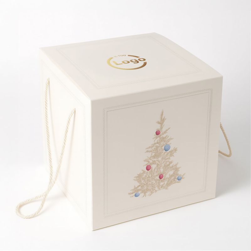 1 kg box for panettone, size 24x24x21 cm, with automatic bottom that can be removed from the sliding band. Made of fine cardboard, it is decorated with a hot stamping (on a 10x10 cm printing area) that embellishes the packaging with refined details. Supplied with a pair of trimming cords, which guarantee elegance and practicality in transport. A premium, ready-to-use solution for artisans, pastry shops and companies that want to stand out with exclusive Christmas packaging.