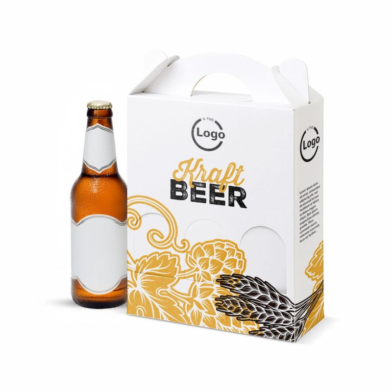 Bottle box mod. MAMBO with dimensions 21.5x6.5x28.5 cm (including handle height 33cm) is ideal for transporting three bottles of 33cl beer safely and practically. Made of microwave cardboard, it is durable and easy to assemble. Equipped with a comfortable handle, it is ideal for long-distance transport. Available in a customized four-color version on the entire surface with the exception of solid bottoms.