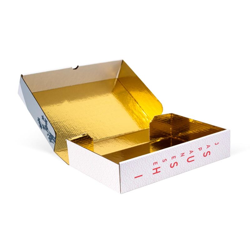 The box mod. MIKADO 15,5x24x5 cm with gold polythene interior is the perfect solution for transporting sweets, biscuits, pies or sushi. This box is to be customized in four-color process on the entire surface with the graphics you prefer and offers the possibility of making windows to show the internal contents.