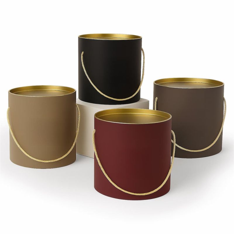 These cylindrical boxes, with a diameter of 25 cm and an internal height of 21 cm (external 23 cm), are made of microwave cardboard coupled with matt lamination, which gives robustness and a sophisticated appearance. The golden tin lid and the thick rigid bottom ensure the strength and protection of the product, while the included rope handle adds a practical and precious detail.