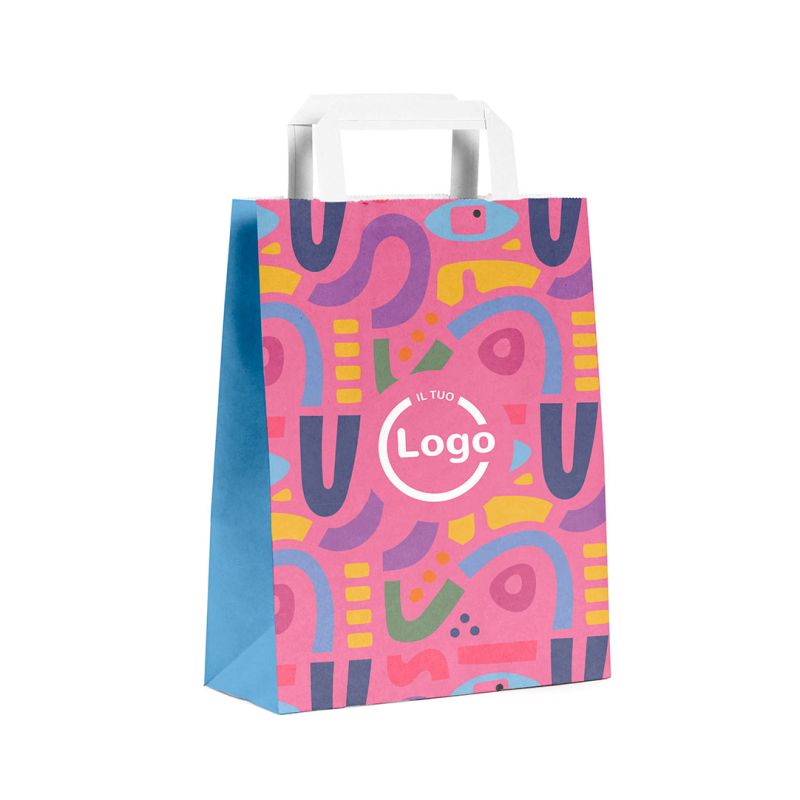 The kraft paper shopper mod. EASY 32+17x28h cm is perfect for holding objects of different shapes and sizes. Made of high-quality kraft paper and available in white or havana, the EASY shopper is perfect for shopping, transporting groceries and much more. You can customize the shopper from 1 to 4 full-bottom colors on two sides including the bellows and choose the type of flat handle.