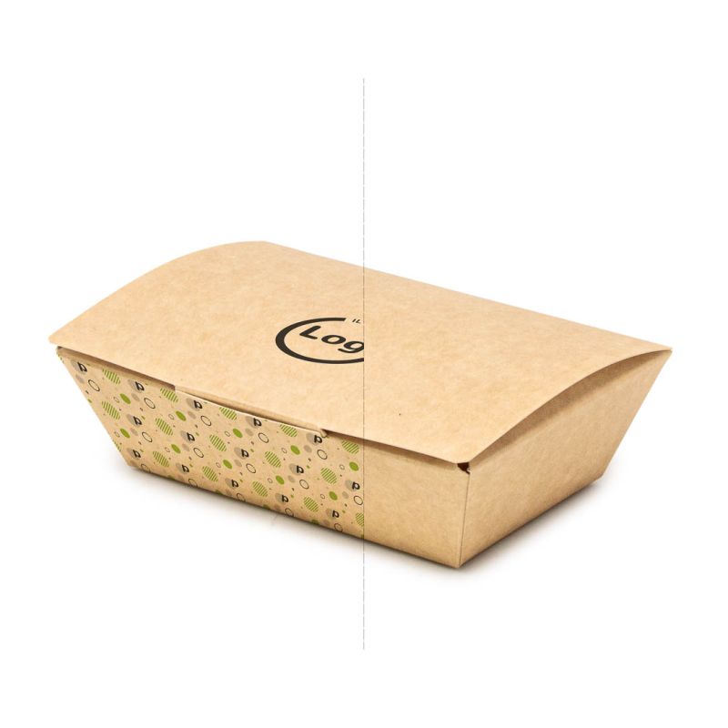 Las cajas mod. B-BOX 9.5x17x6.5 cm se puede personalizar hasta 4 colores de fondo completo y son perfectos para alimentos como fritos, kebabs y pescado. Fabricadas en papel con interior de polietileno, garantizan la máxima protección y una presentación elegante de los productos.