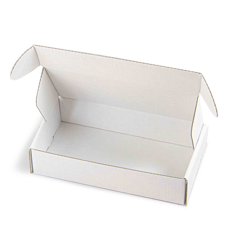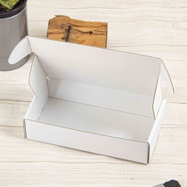 Las cajas para envíos mod. SHIP, sin impresión, miden 9x18x4 cm y están fabricadas en cartón microondas vegetal blanco o habana.