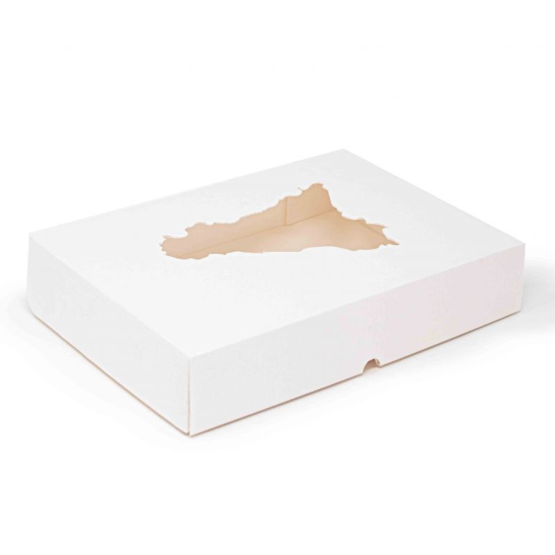Las cajas mod. Los JEFF 24,5x31x5 cm anónimos son perfectos para la pastelería gracias a su forma rectangular y apertura de caja. Fabricados en cartón para microondas, son aptos para uso alimentario e ideales para contener pasteles, galletas, dulces y tartas. También son aptos para el envío. También disponible con ventana superior elíptica, rectangular o con forma de Sicilia para ver el contenido.