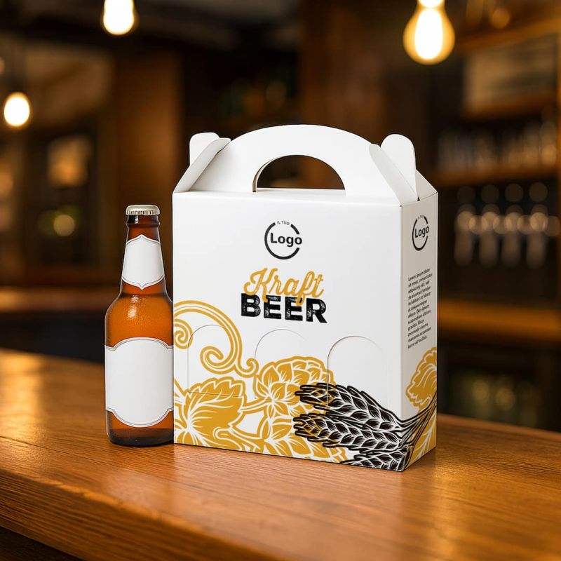 Hecha de cartón para microondas, esta caja es resistente y duradera y adecuada para contener tres botellas de cerveza estándar de 33cl.