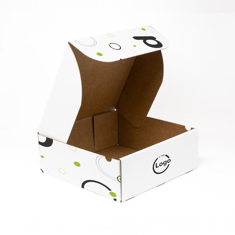 La caja mod. FRANK 30x30x8 cm con apertura de caja se puede personalizar en proceso de cuatro colores en toda la superficie (sin fondos completos) y está hecho de cartón microondas blanco o habana. Adecuado para productos alimenticios y no alimenticios, es ideal para el envío.