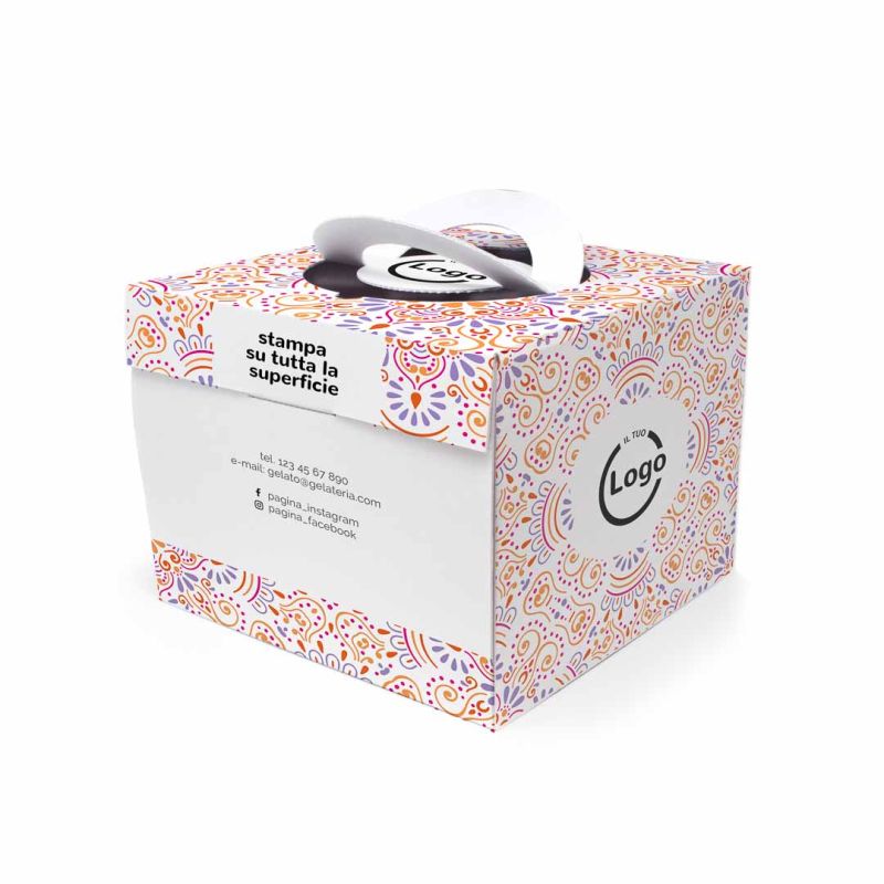 La cake box mod. SMILE 25x25x18 cm es la solución perfecta para presentar y transportar tartas y dulces. Equipado con asas elevadoras y ventana plastificada, le permite mostrar el producto dentro de la caja. El producto se personaliza en un proceso de cuatro colores en toda la superficie.