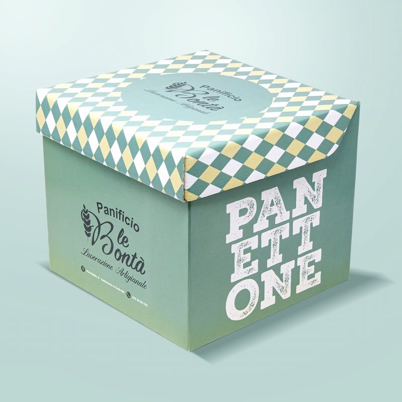 Caja de fondo sólido de 1 kg para panettone, en cartón brillante acoplado a cannettè blanco. Impresión offset a cuatro colores con barnizado, laminable en brillo o mate. Bajo pedido, estampado en caliente, serigrafía en relieve y gráficos internos personalizados para un resultado de alto impacto.