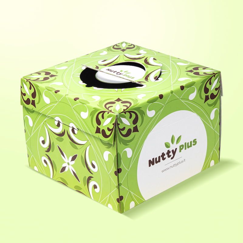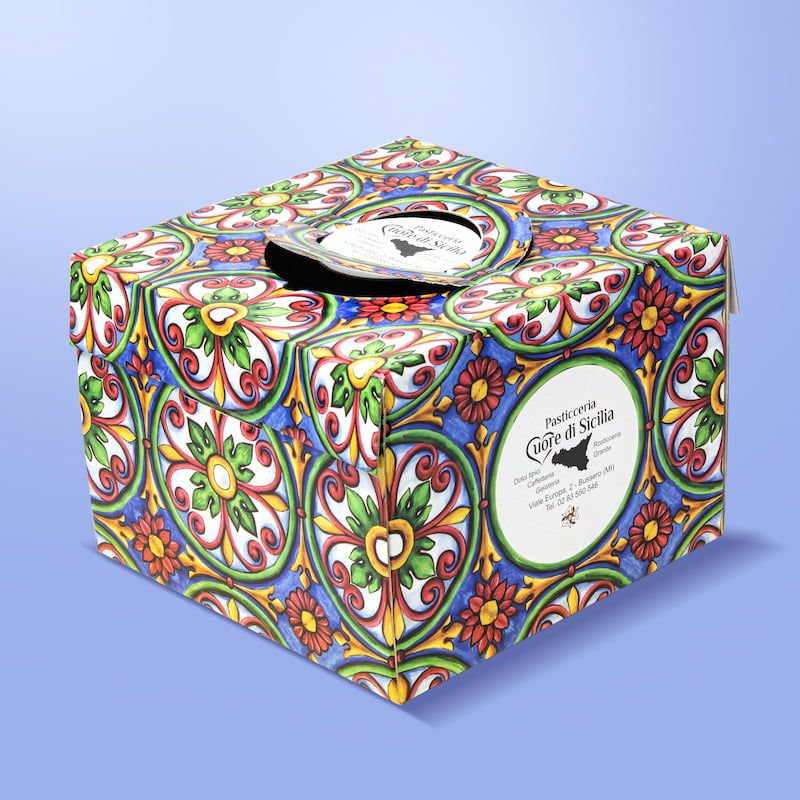 Caja de fondo macizo para panettone de 750 g, en cartón brillante acoplado a cannettè blanco. Impresión offset a cuatro colores con barnizado, laminable en brillo o mate. Valiosos acabados están disponibles bajo pedido: estampado en caliente, serigrafía en relieve e impresión interna personalizada.