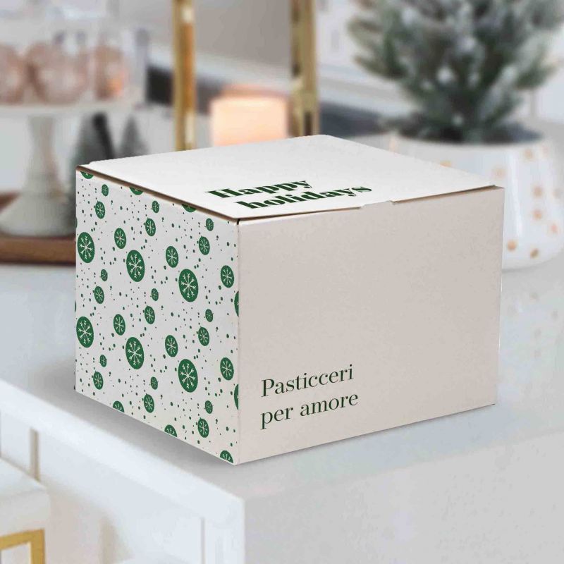 Caja personalizada para panettone de 750 g, tamaño 23x23x16 cm, en cartón vegetal KBKBKB para microondas (triple blanco), resistente y apta para el contacto con alimentos. La impresión digital a cuatro colores permite la personalización en toda la superficie, pero no permite fondos completos ni grandes áreas uniformes de color. No hay pintura, laminación o acabado disponible. Una solución práctica, sostenibile y rentable para paquetes de temporada o tiradas cortas. 100% reciclable.