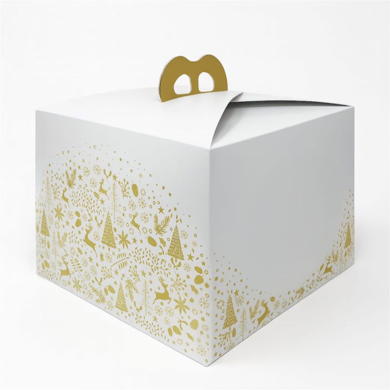 Caja de 1 kg para panettone, tamaño 25x25x18 cm, fabricada en cartón plano con laminado exterior brillante (excepto modelo Habana). Sin personalización. Disponible en varias variantes gráficas: blanco brillante, habana, con gráficos "SNOW" marrones o rojos, rojo/marrón/dorado "REDS" y "SLED". Equipado con un asa integrada para un transporte práctico y seguro. Ideal para envases finos de Navidad.