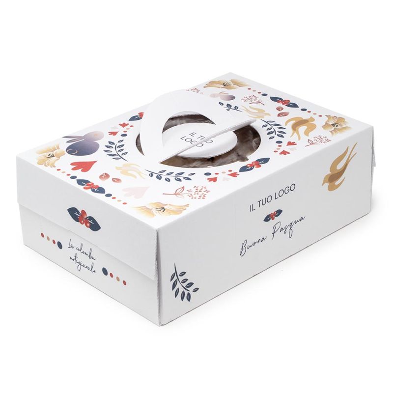 Caja para paloma artesanal mod. Chic 34,5x24,5x11,5 cm (dimensiones internas) fabricado en cartón vegetal para microondas, con apertura lateral, ventana superior y asa elevable. Ideal para envasar tu tarta de Pascua o cualquier preparación de repostería, palomas artesanales o tartas, de forma práctica y elegante. La caja se puede personalizar en proceso de cuatro colores en toda la superficie con la excepción de fondos sólidos, y es adecuada para uso alimentario.