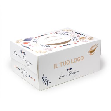 Caja para paloma artesanal mod. Chic 32,5x24,5x15 cm (dimensiones internas) fabricado en cartón vegetal para microondas, con apertura lateral, ventana superior y asa elevable. Ideal para envasar tu tarta de Pascua o cualquier preparación de repostería, palomas artesanales o tartas, de forma práctica y elegante. La caja se puede personalizar en proceso de cuatro colores en toda la superficie con la excepción de fondos sólidos, y es adecuada para uso alimentario.