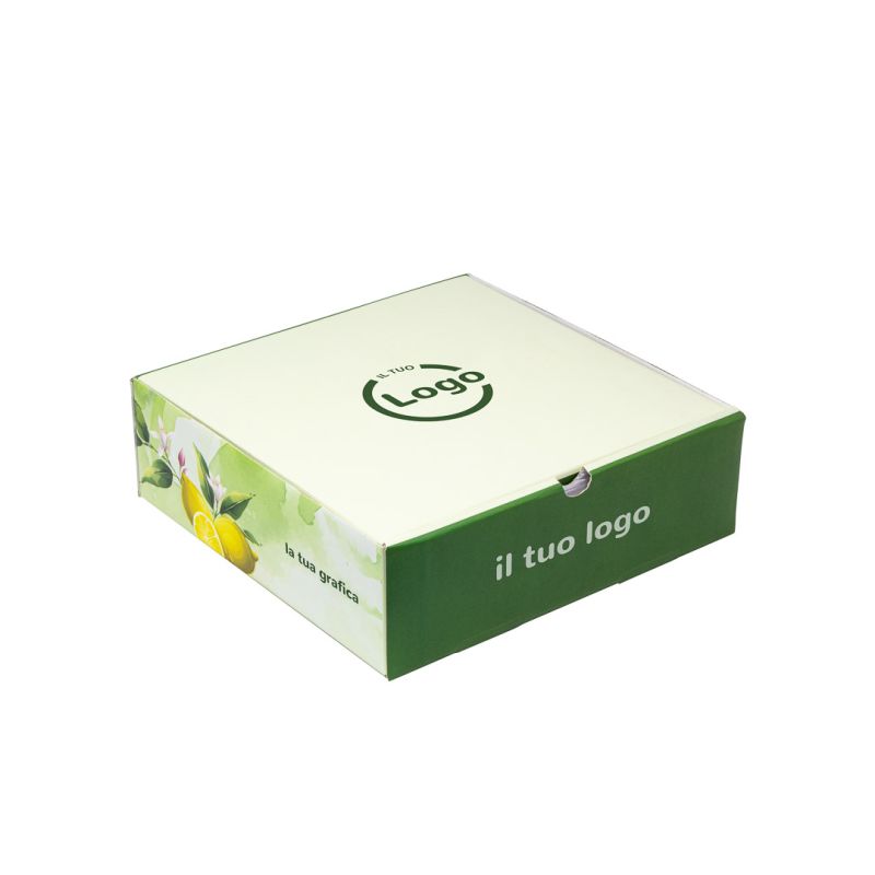 La caja modelo Frank 23x23x7 cm en cartón microondas acoplada con cartón recubierto se puede personalizar con el logotipo y/o gráficos de cuatro colores en toda la superficie. Disponible con fondo blanco o habanero, es ideal para envasar pasteles, galletas, tartas, cannoli y productos no alimenticios, garantizando protección y elegancia.
