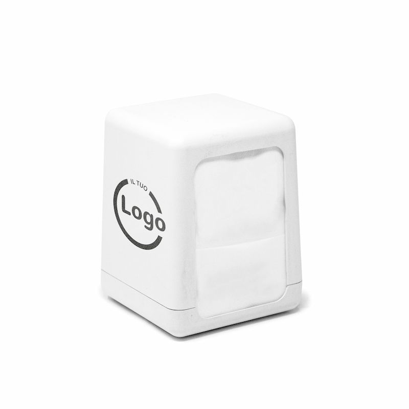 Dispensador de servilletas ABS personalizado de 17x17 cm en un área de 7x7 cm con su logotipo hasta 2 colores. Ideal para bares y pastelerías. Facilita la distribución de servilletas a los clientes.