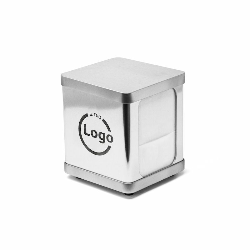 Dispensador de servilletas de 17x17 cm personalizado en zona de 8x8 cm con tu logo en 1 color, ideal para bares y pastelerías. Facilita la distribución de servilletas a los clientes.