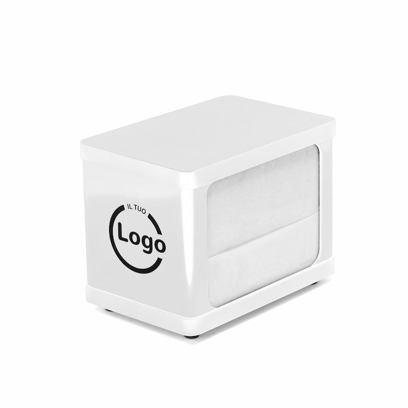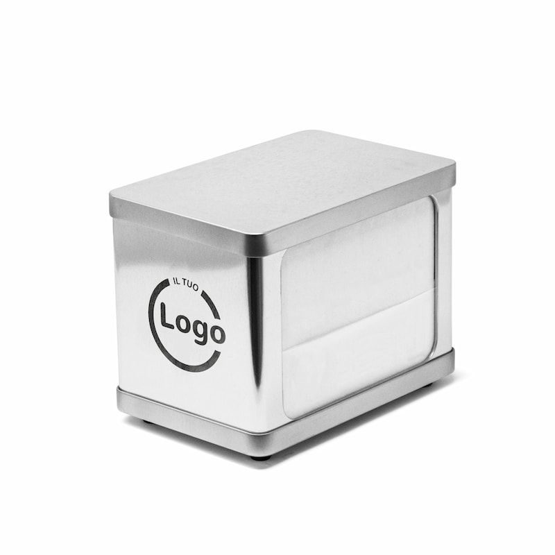 Dispensador de servilletas de 17x17 cm personalizado en zona de 8x8 cm con tu logo en 1 color, ideal para bares y pastelerías. Facilita la distribución de servilletas a los clientes.