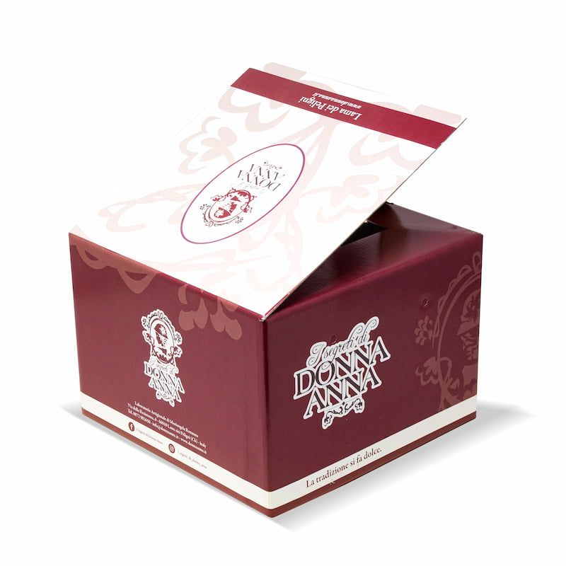Boîte panettone de 750 g, format 23x23x16 cm, en carton laminé de haute qualité avec impression offset en quadrichromie sur toute la surface, même avec des fonds unis et des graphiques complexes. Des processus supplémentaires tels que le pelliculage brillant/mat, l’estampage à chaud ou la sérigraphie peuvent être ajoutés, ainsi que la personnalisation interne. Une solution premium, résistante et élégante, conçue pour mettre en valeur vos produits artisanaux et rendre l’emballage unique.