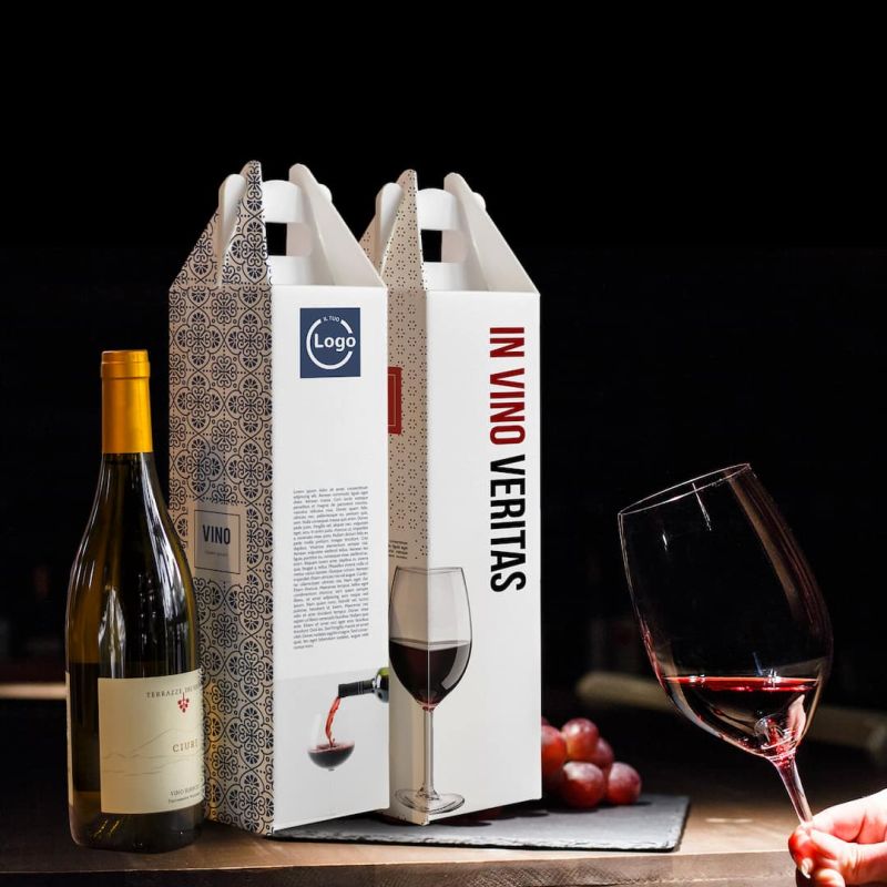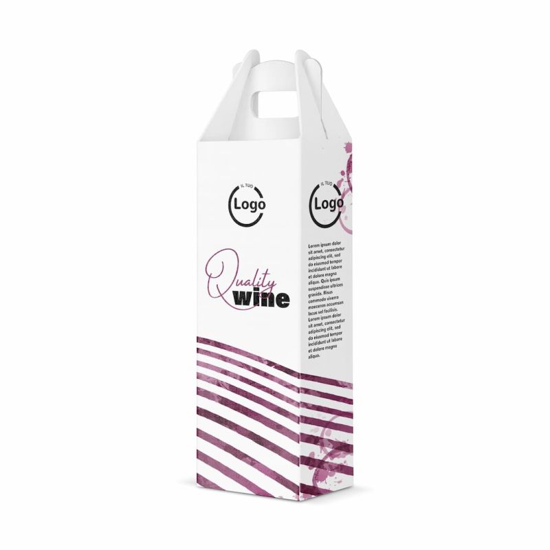 Bouteille boîte mod. MAMBO mesurant 10x10x34 cm est idéal pour transporter en toute sécurité et facilement une bouteille de vin ou d’huile. Fait de carton micro-ondes, il est durable et facile à assembler. Equipé d’une poignée confortable, il est idéal pour le transport longue distance. Disponible en version quadrichrome personnalisée sur toute la surface à l’exception des fonds complets.