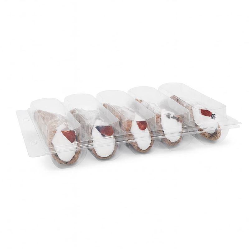Récipient neutre pour 5 cannoli, en OPS transparent, sans impression. Les dimensions totales sont de 290×180×50 mm, avec 5 cavités en forme de 47×160×50 mm chacune. Parfait pour stocker et présenter les cannoli de manière élégante et pratique, en assurant la visibilité et l’hygiène du produit. Solution idéale pour les pâtisseries, les bars et les coffrets cadeaux.