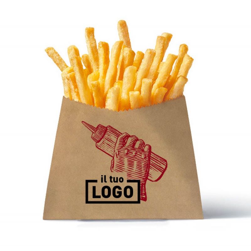 Sacs en papier blanc ou kraft Havane résistant à la graisse, personnalisables jusqu’à 3 couleurs sur toute la surface à l’exception des fonds pleins. Idéal pour les aliments chauds tels que les frites, les ailes de poulet, les rondelles d’oignon, le poisson frit. Parfait pour les friteuses, la restauration rapide, la cuisine de rue.