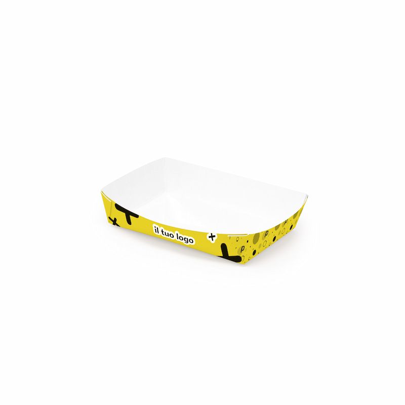 Plateaux en carton polyéthylène mod. PLIER 6,5x10x4 cm - Personnalisé jusqu’à 4 couleurs avec fond complet pour la friture, les aliments chauds et froids dans le monde de la gastronomie et de la restauration rapide.