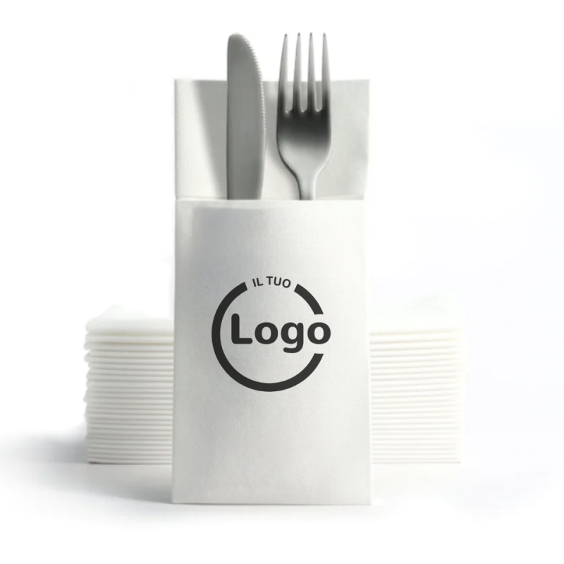 Serviettes de poche en papier 40x40 cm P/8 personnalisables avec votre logo jusqu’à deux couleurs. Idéal pour les bars, restaurants, pâtisseries et tous les endroits où la serviette est indispensable pour un service de nettoyage adéquat de la bouche et des mains.