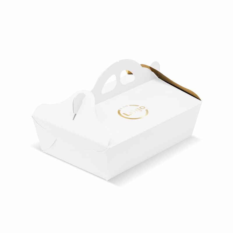 Le mod. SWEET blanc avec intérieur et poignée dorés, caractérisé par une fermeture à emboîtement, est parfait pour les pâtisseries et les boulangeries qui souhaitent emballer et transporter leurs produits de boulangerie en toute sécurité et avec élégance. Fabriquées en papier cartonné pliable de haute qualité, ces boîtes ont une poignée durable et facile à transporter.