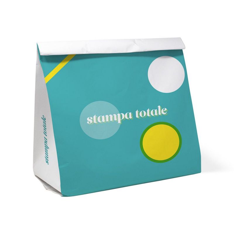Buste in carta mod. EASY 23x12x31 cm personalizzate a 4 colori su tutta area. Perfette per il food e l'asporto di oggettistica, cosmetici e abbigliamento. Resistenti e ecosostenibili, l'assenza di fondo quadro garantisce un ingombro minimo.