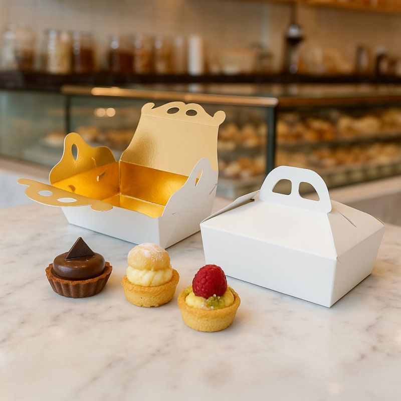 Le scatole porta paste mod. SWEET bianche plastificate con interno oro e manico, caratterizzate da una chiusura ad incastro, sono perfette per pasticcerie e panifici che desiderano confezionare e trasportare i loro prodotti da forno in modo sicuro ed elegante. Realizzate in cartoncino teso di alta qualità, queste scatole sono dotate di un manico resistente e facile da trasportare.