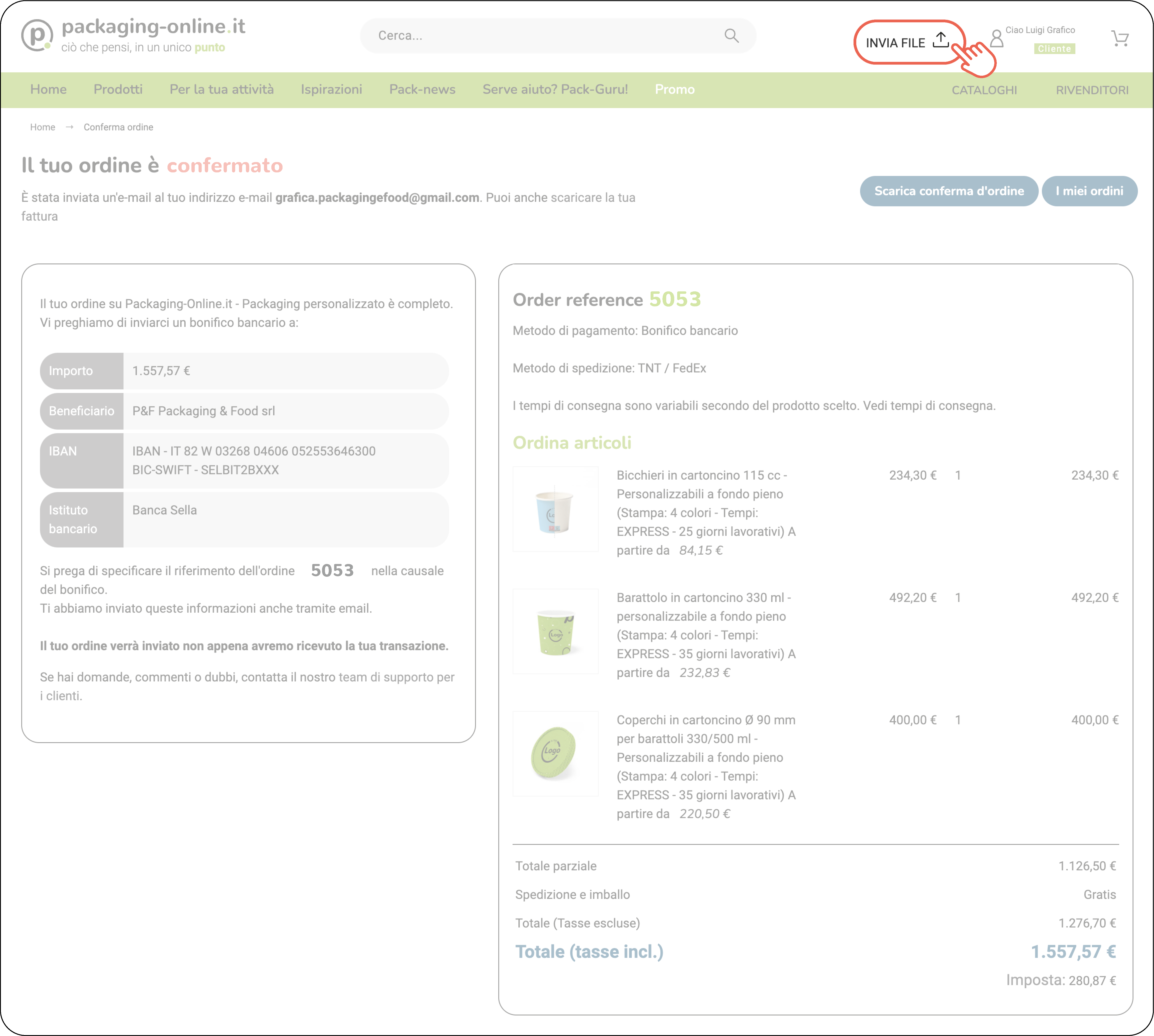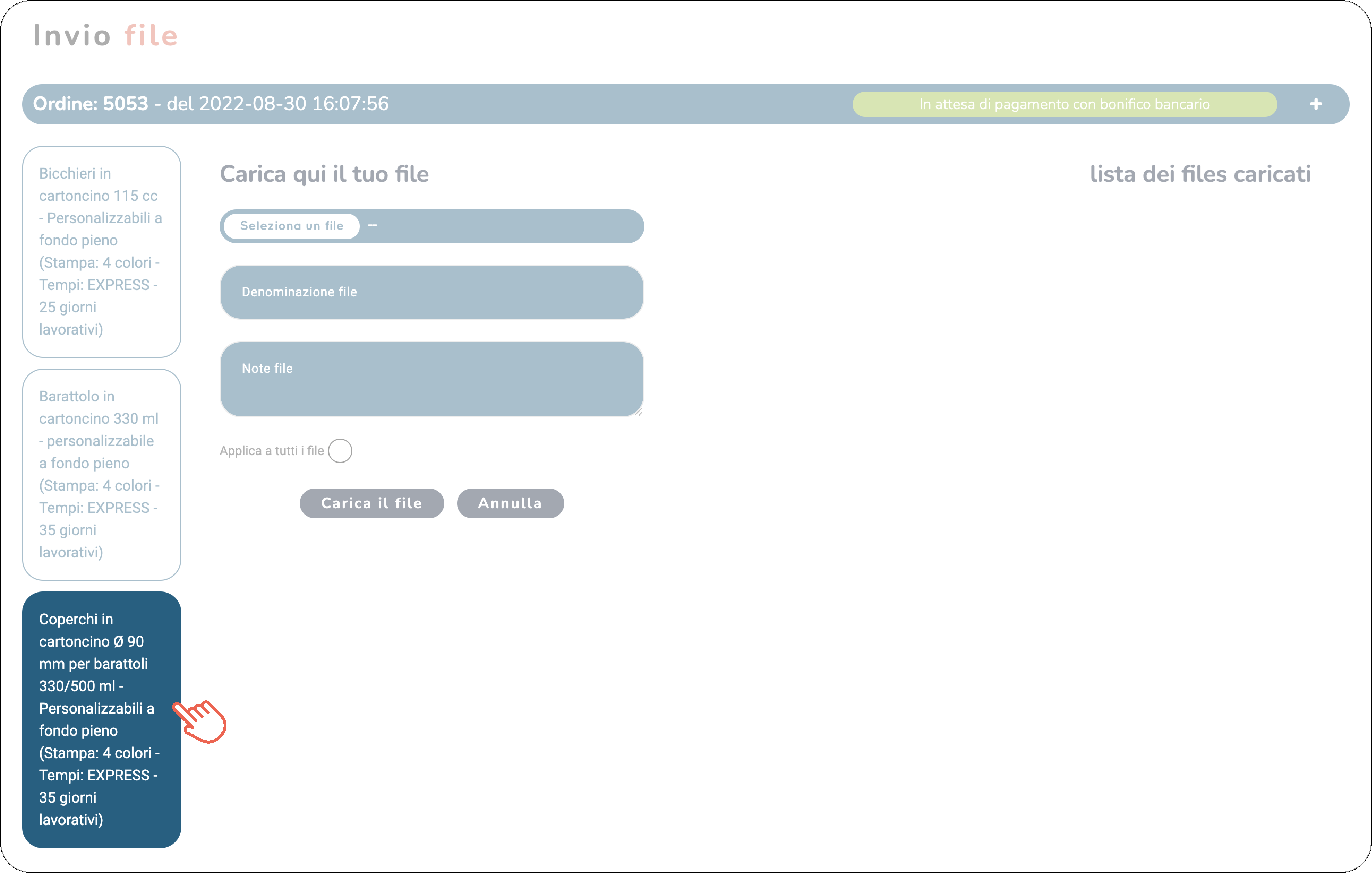 A questo punto basterà cliccare suarea invio file vicino al nome utente per accedere agli ordini che necessitano di una stampa personalizzata.