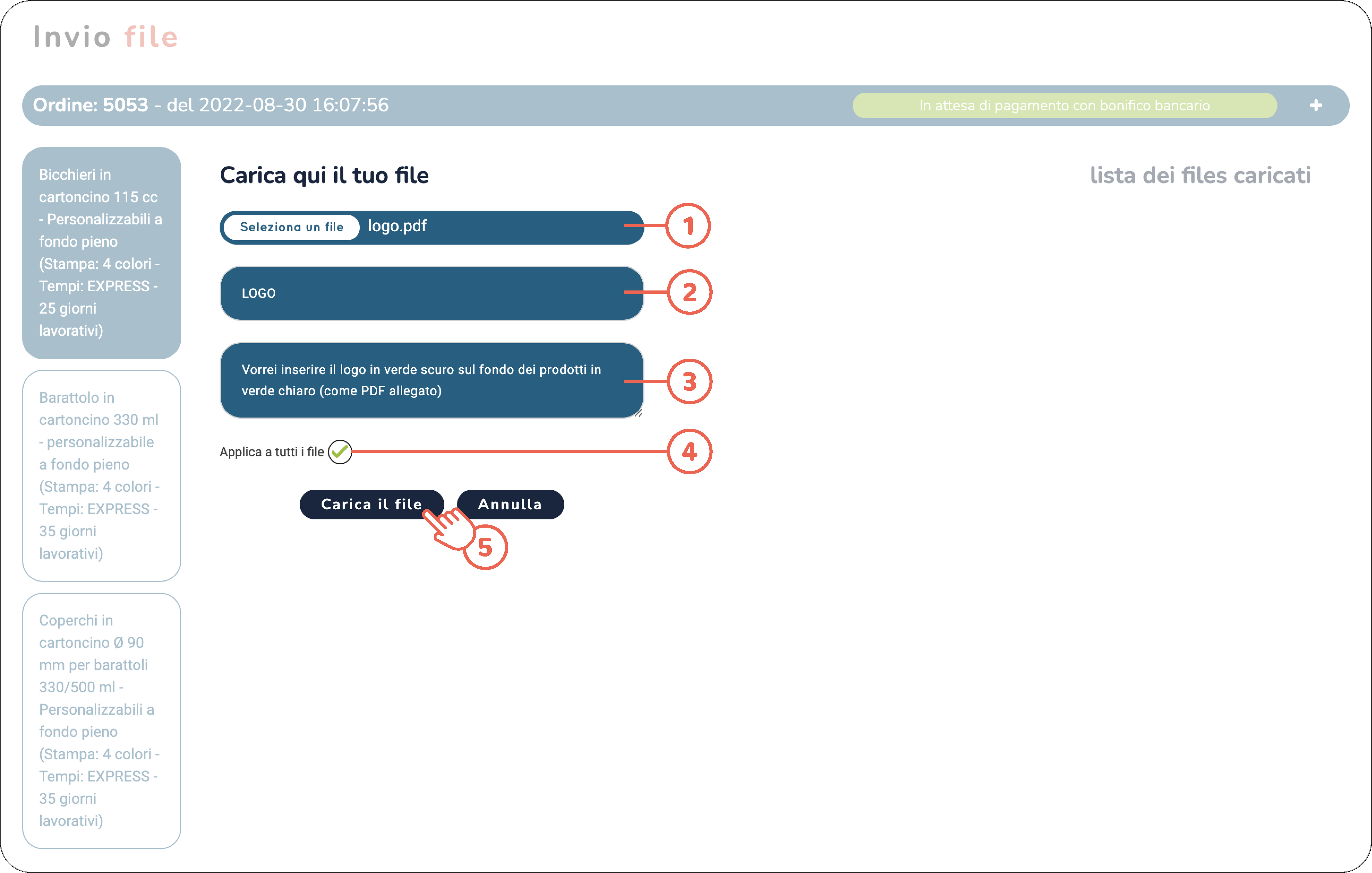 4. Se vuoi che il file verrà caricato su tutti gli articoli presenti nell’ordine basterà spuntare “applica a tutti i file”. Se, in caso contrario, vuoi inserire un file grafico diverso per ogni articolo presente nell’ordine dovrai lasciare il campo vuoto e proseguire cliccando sul bottone “carica il file” (5).