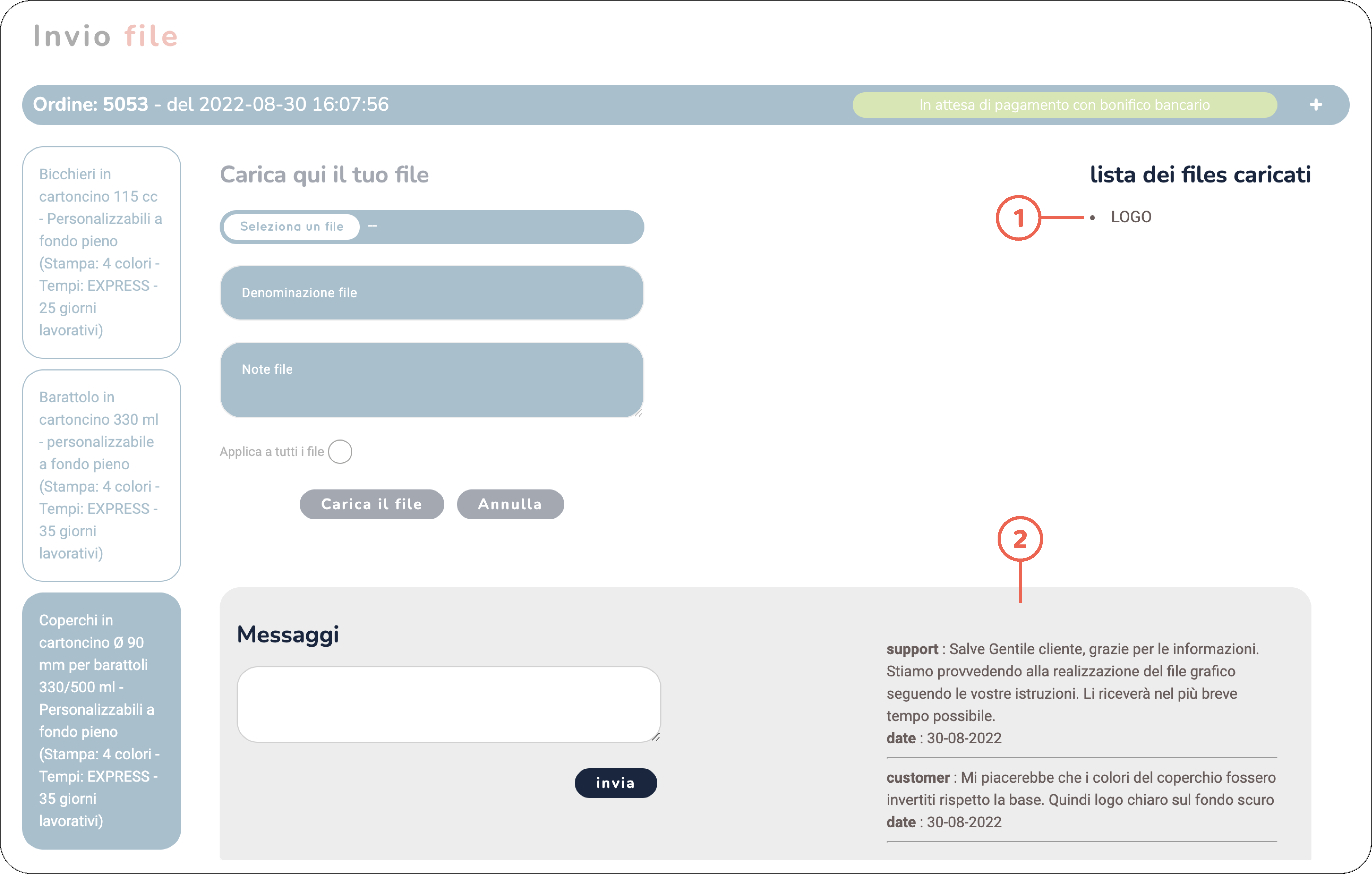 Dopo aver caricato tutti i file grafici necessari a un corretto proseguimento dell’ordine noterai che sulla destra (1) l’elenco dei file verrà arricchito sotto la voce “lista dei files caricati”, in basso invece, si aprirà un’area di messaggistica (2) per tutte le comunicazioni tra te e i nostri designer che ti informeranno di tutti i processi che avverranno da questo momento fino all’approvazione della bozza grafica.