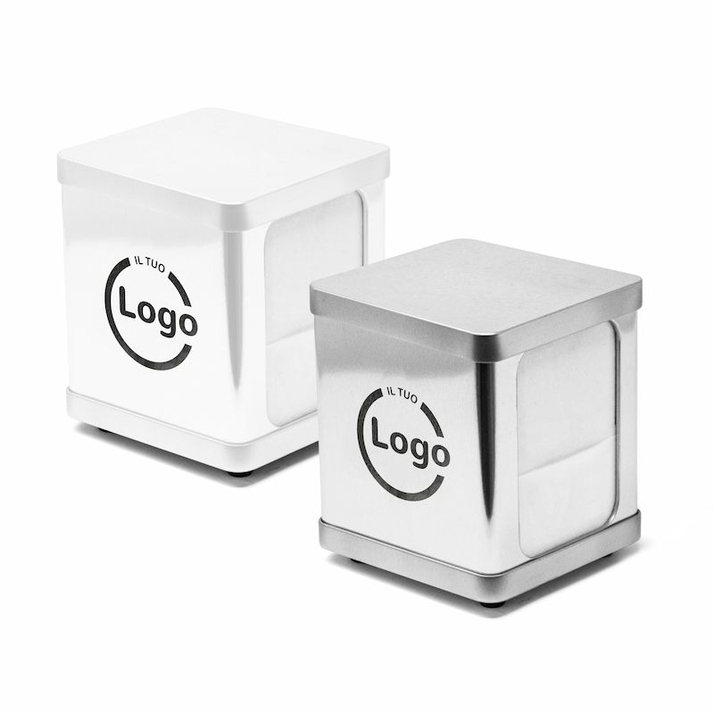 Distributore per tovaglioli 17x17 cm in latta personalizzato su area 8x8 cm con il tuo logo ad 1 colore, ideale per bar e pasticcerie. Facilita la distribuzione dei tovaglioli ai clienti.