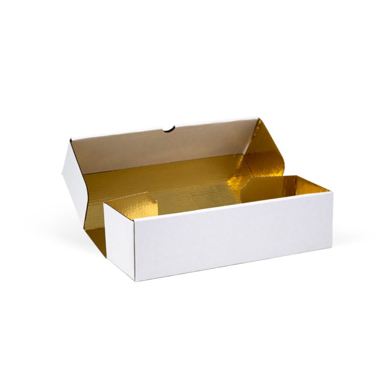 La scatola mod. MIKADO 22x7x6 cm con interno politenato oro è la soluzione perfetta per il trasporto di dolci come macaron, biscotti, crostate o sushi. Questa scatola è senza stampa e offre la possibilità di effettuare delle finestre per far vedere il contenuto interno.