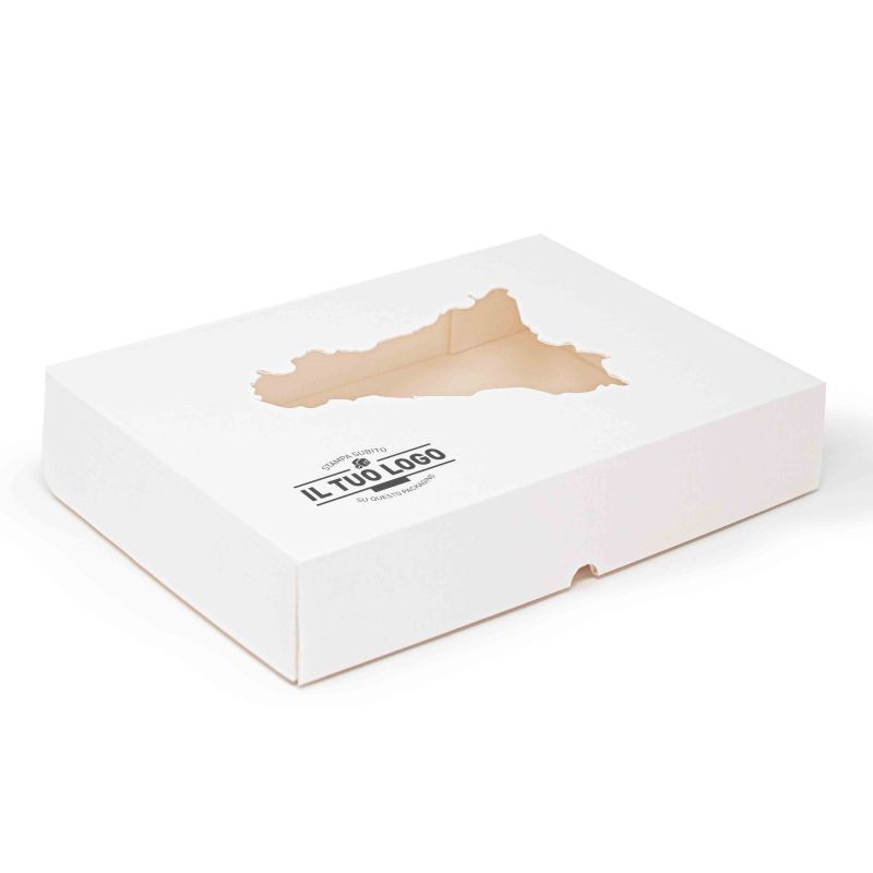 Realizzate in cartoncino microonda certificato per uso alimentare, sono personalizzabili in quadricromia su tutta la superficie (no fondo pieno) e possono essere dotate di finestra superiore plastificata a forma di ellisse, rettangolare o sicilia per valorizzare il contenuto.