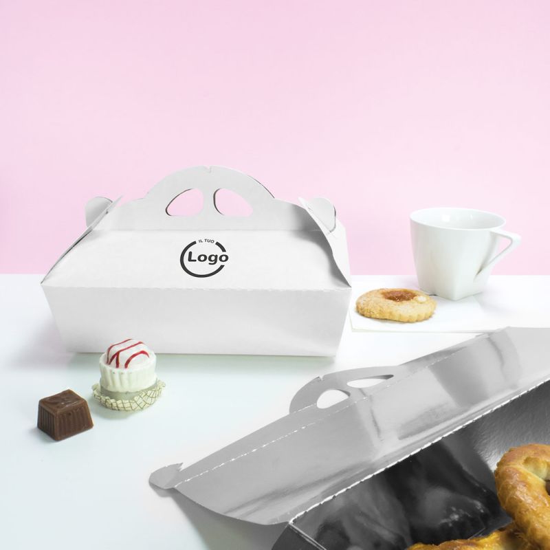 Le scatole porta paste mod. SWEET bianche con interno oro e manico, caratterizzate da una chiusura ad incastro, sono personalizzabili con stampa a caldo ad 1 colore su un'area predefinita di 13x6 cm. Ideali per presentare dolci e biscotti con stile, queste scatole sono realizzate con materiali di alta qualità e sono disponibili in diverse misure per adattarsi alle tue esigenze.